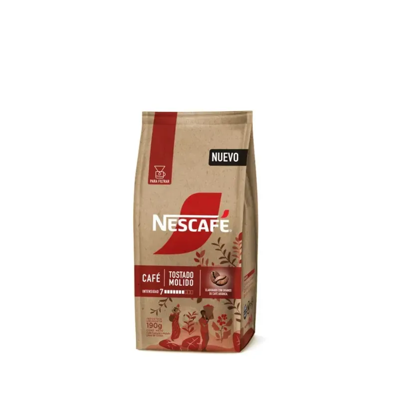 Cafe Tostado Molido Puro Nescafe 190 gr Para disfrutar de un café 100% puro en tu cafetera de filtro. Elaborado con granos de origen responsable, es la alternativa perfecta para los amantes del buen café todos los días. Libre de gluten y sin T.A.C.C., es ideal para cuidar tu salud.