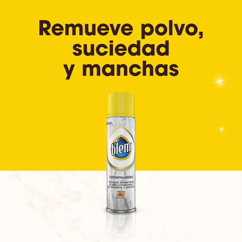 Blem Lustramuebles Naranja es ideal para el cuidado de tus superficies de piedra. Este lustramuebles en aerosol limpia, da brillo y protege, removiendo polvo, suciedad y huellas dactilares. Apto para múltiples superficies como el granito, mármol y cuarzo