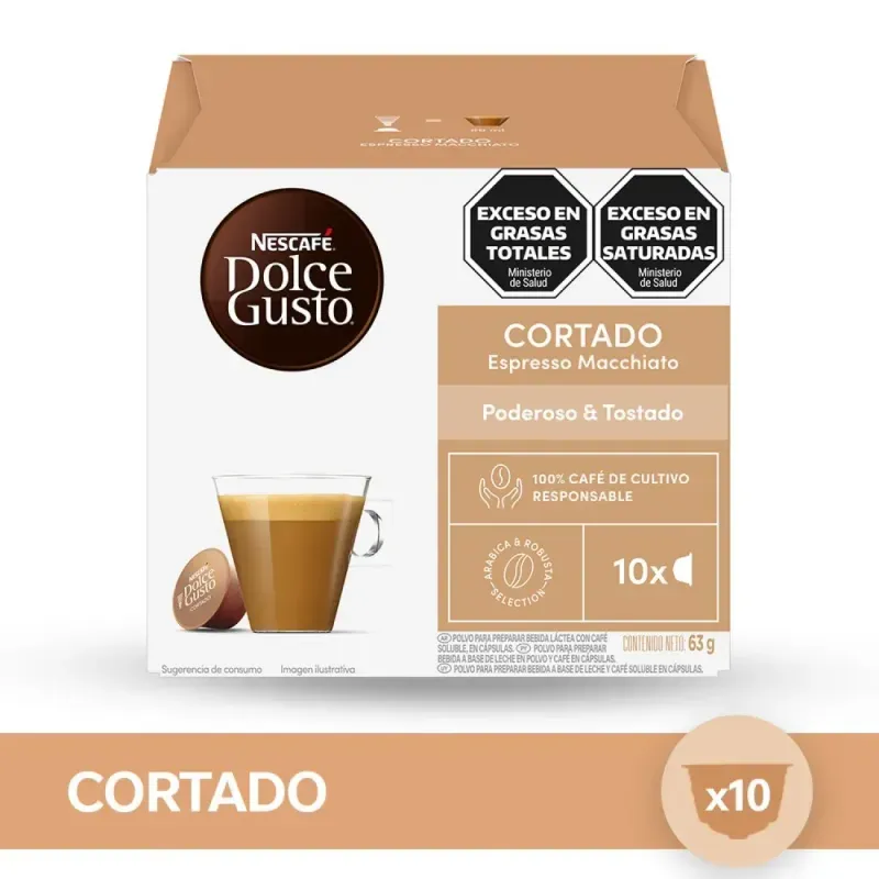 Cafe en Capsula Cortado Espresso Macchiato Nescafe Dolce Gusto 63 gr 10 Viví la experiencia del clásico café de bar en casa con este espresso corto y potente, suavizado con un toque de leche. Inspirado en el auténtico cortado, combina granos Arábica premium y Robusta para un sabor lleno de carácter.